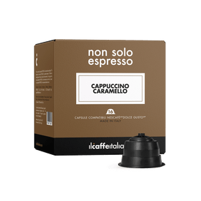 Compatibili Dolce Gusto®* Cappuccino al gusto caramello. La bevanda perfetta per dare un tocco goloso alla tua colazione o alla tua pausa pomeridiana. Ideale sia durante i mesi freddi che in estate, questa bevanda regala un mix di note profumate generate del caffè, unite alla cremosità del latte e alla dolcezza del caramello.